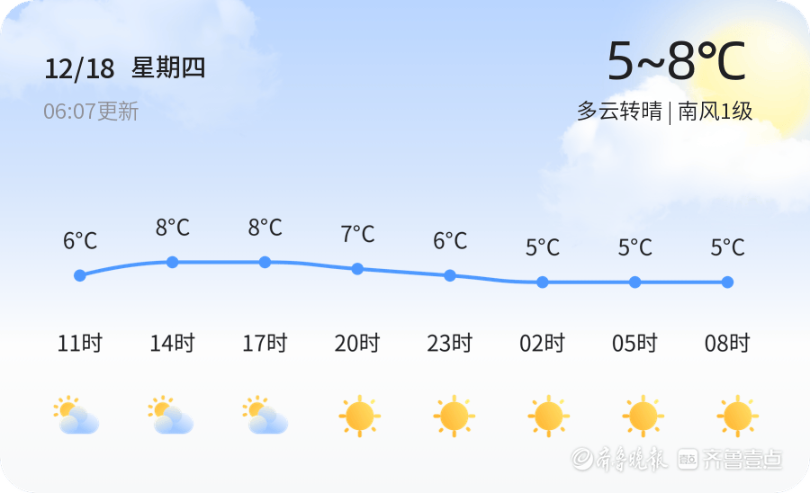 今天是12月18日,星期四,农历十月廿九。临沂市今日天气多云转晴,气温介于5℃至8℃之间,南风1级,空气湿度为78%。空气质量状况良好(PM2.5为98),适合市民户外活动。早晨气温较低,建议市民出行时注意保暖,同时关注交通状况,确保出行安全。