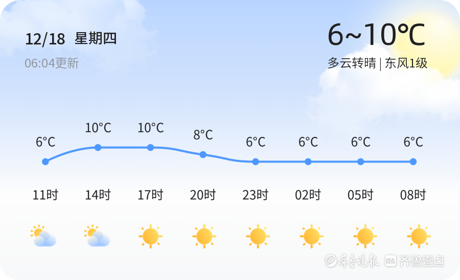 今日(12月18日,农历十月廿九)济宁市天气多云转晴,气温介于6℃至10℃之间,东风1级,空气湿度为70%。目前空气质量状况为轻度污染(PM2.5指数为120),敏感人群应减少户外活动。市民出行时请注意保暖,随身携带雨具以备不时之需。