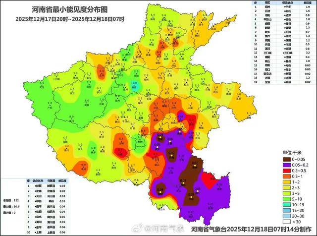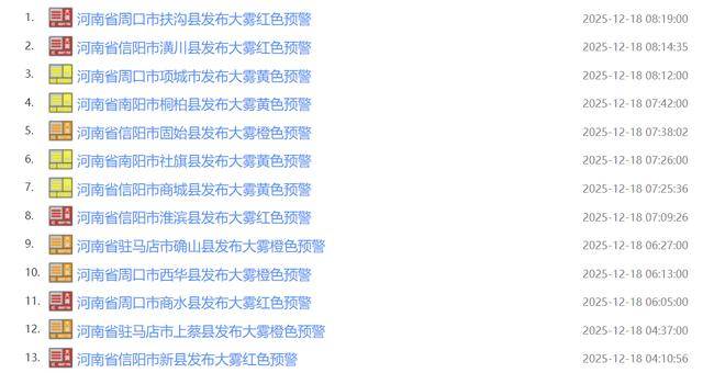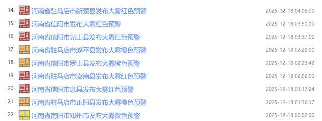 能见度小于50米,河南周口扶沟县、信阳潢川县、驻马店新蔡县等多地发布大雾红色预警!