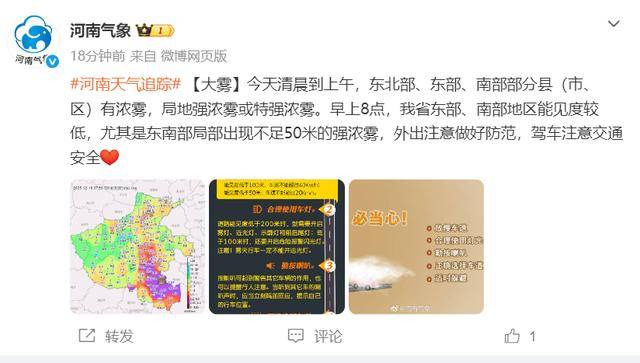 今天清晨到上午,东北部、东部、南部部分县(市、区)有浓雾,局地强浓雾或特强浓雾。早上8点,河南东部、南部地区能见度较低,尤其是东南部局部出现不足50米的强浓雾,外出注意做好防范,驾车注意交通安全