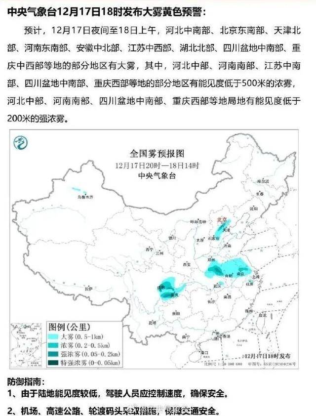 预计,12月17日夜间至18日上午,河北中南部、北京东南部、天津北部、河南东南部、安徽中北部、江苏中西部、湖北北部、四川盆地中南部、重庆中西部等地的部分地区有大雾,其中,河北中部、河南南部、江苏中南部、四川盆地中南部、重庆西部等地的部分地区有能见度低于500米的浓雾,河北中部、河南南部、四川盆地中南部、重庆西部等地局地有能见度低于200米的强浓雾。