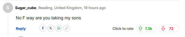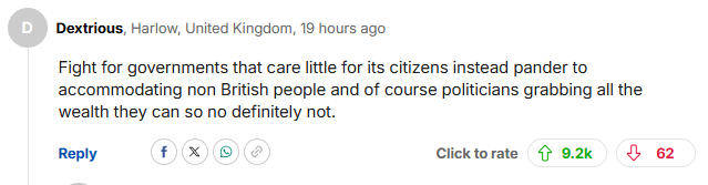 最高赞写道:“为那些漠视公民的政府、贪婪的政客和非英国人而战,绝对不行。”