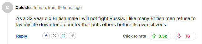 “作为一名32岁的英国男性,我不会与俄罗斯作战。我和许多英国男性一样,拒绝为一个把别国人置于本国公民之前的国家付出生命。”