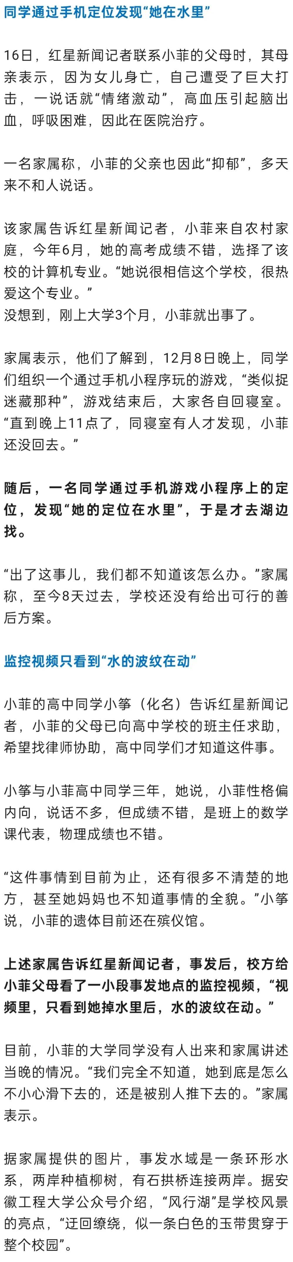 12月16日,红星新闻记者通过家属了解到,遇难者小菲(化名)是一名安徽籍大一新生,12月8日晚,她在参加学生组织的户外游戏时掉入校内的湖中,由于天色已晚,事发后许久无人察觉,后来寝室同学根据手机游戏小程序发现“她的定位在水里”,被打捞起来时她已经死亡。