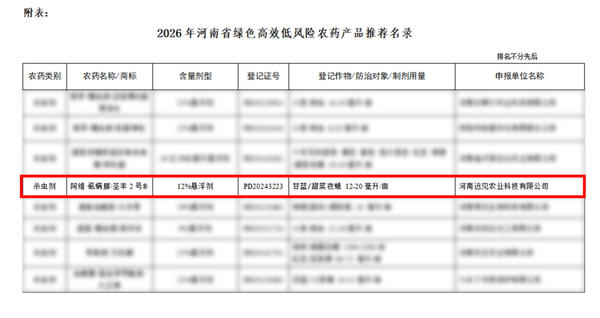 据悉,绿色高效低风险农药产品推荐名录的筛选,严格遵循安全性、高效性、环保性等核心原则,经过企业申报、材料审核、专家评审等多环节严格把关,最终选出一批能够满足农业绿色发展需求、保障农产品质量安全的优质农药产品。此次河南远见两款产品同时入选,不仅是对其产品实力的权威认可,也彰显了企业在绿色农药研发与推广领域的行业竞争力。