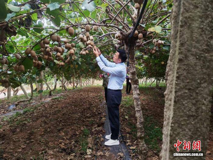 “赛博果园”主人范俊辰在果园内查看猕猴桃长势。 安义县委宣传部供图