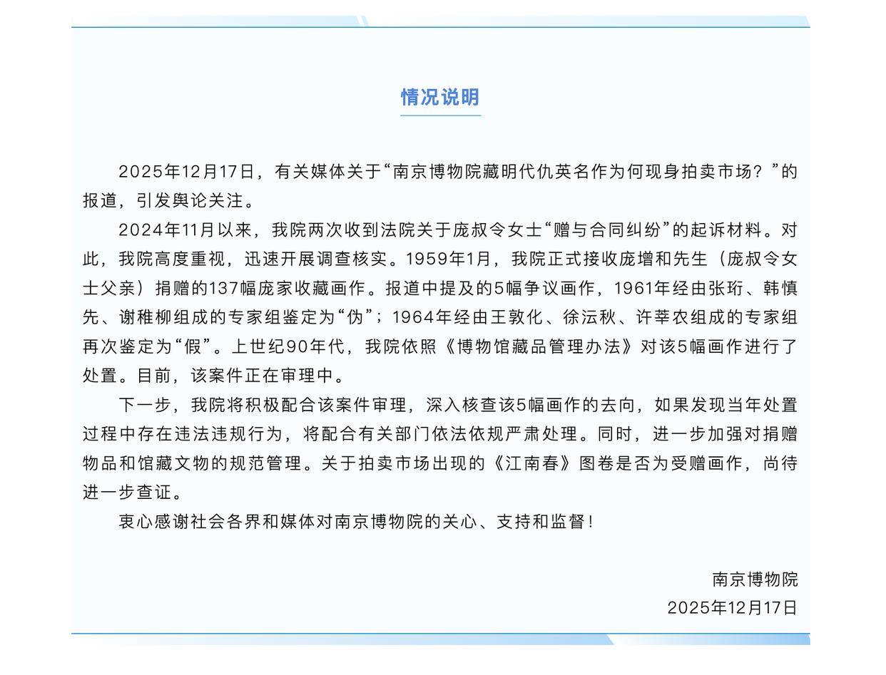 12月17日,南京博物院回应:拍卖市场出现的《江南春》图卷是否为受赠画作,尚待进一步查证;庞叔令提及的5幅争议画作因于1961年、1964年两次被鉴定为伪作,上世纪90年代,已经依照《博物馆藏品管理办法》对该5幅画作进行了处置。