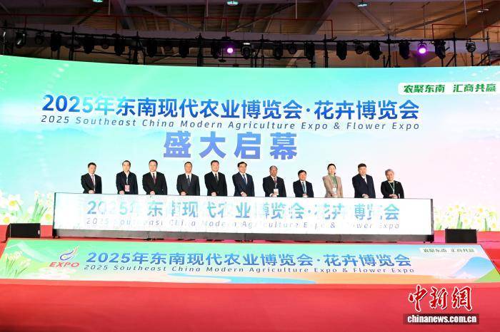 12月18日,2025年东南现代农业博览会·花卉博览会在福建漳州东南花都花博园开幕。本届展会以“农聚东南 汇商共赢”为主题,围绕“品牌引领、科技加持、基金赋能、产业落地”四大核心要点,吸引400余家海内外企业参展。图为开幕式现场。中新社记者 张金川 摄