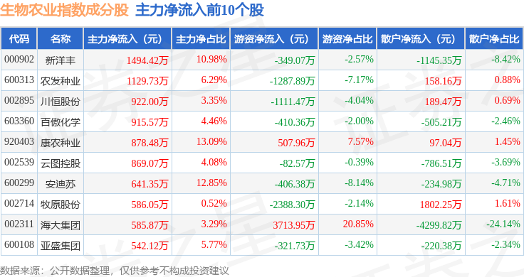 资金流向方面,生物农业(980072)指数成份股当日主力资金净流出合计8.11亿元,游资资金净流入合计1.45亿元,散户资金净流入合计6.85亿元。成份股资金流向详情见下表: