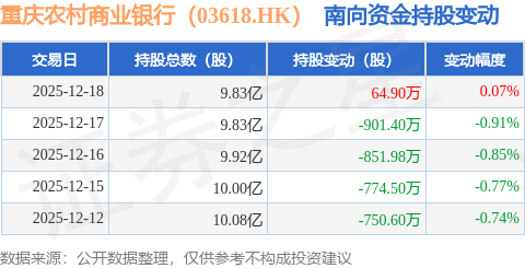 证券之星消息,12月18日南向资金增持64.9万股重庆农村商业银行(03618.HK)。近5个交易日中,获南向资金减持的有4天,累计净减持3213.58万股。近20个交易日中,获南向资金减持的有18天,累计净减持7001.58万股。截至目前,南向资金持有重庆农村商业银行(03618.HK)9.83亿股,占公司已发行普通股的39.12%。