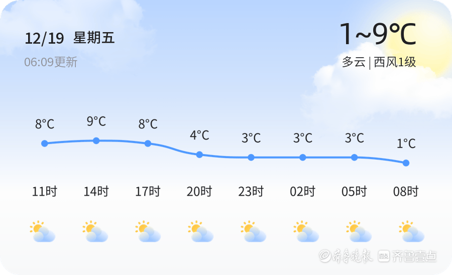 今天是12月19日,农历十月三十,星期五。德州市今日天气多云,气温在1℃至9℃之间,西风1级,空气湿度95%。目前空气质量为中度污染,PM2200,建议敏感人群减少外出,必要时佩戴口罩。今日气温较低,市民出行请注意保暖,尤其是早出晚归的朋友,建议增添衣物以应对寒冷天气。此外,德州市部分地区已发布大雾红色预警,请市民注意防范大雾带来的不利影响,确保出行安全。