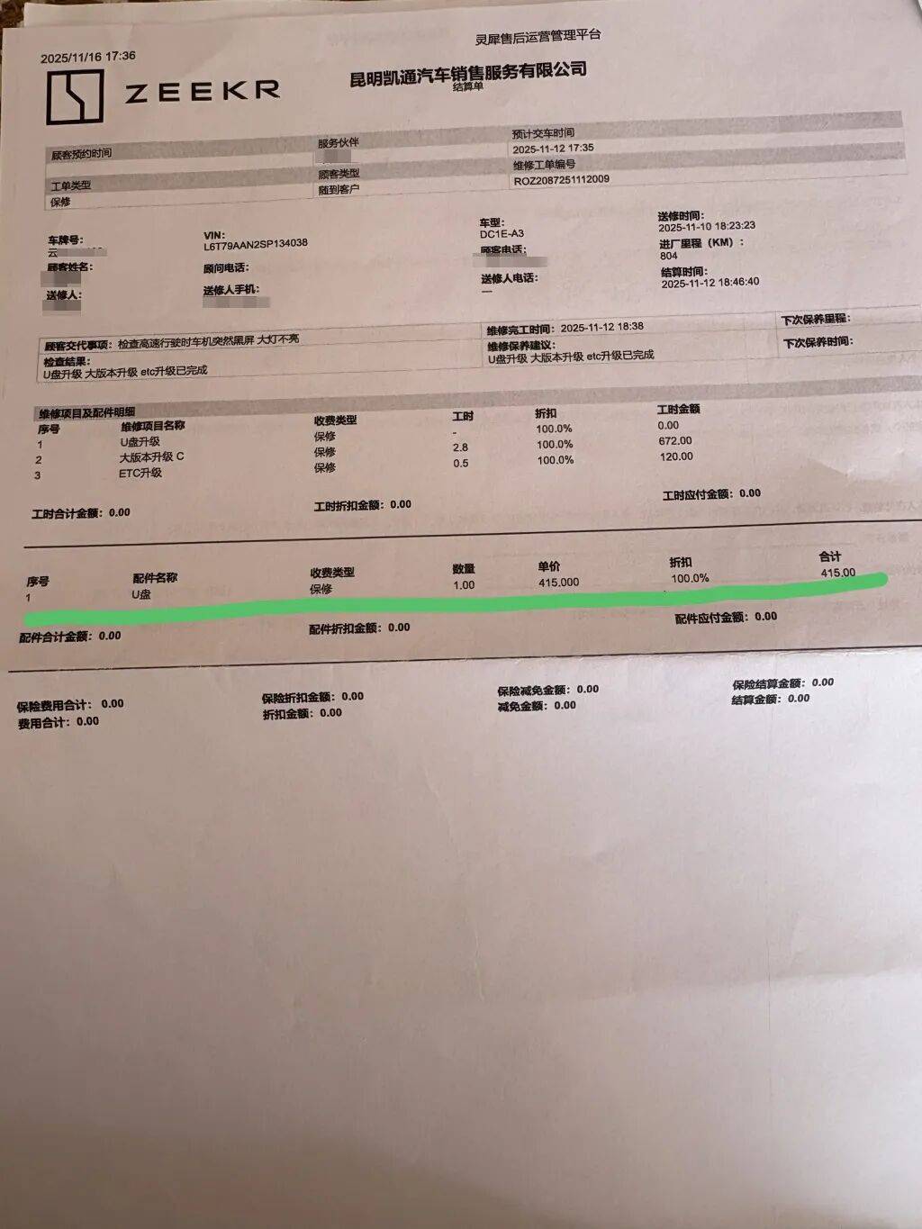 11月24日,门店通知周女士故障已修复,可随时提车。周女士提供的保修工单结算单显示,她的车辆维修项目为“U盘升级”、“大版本升级C”和“ETC升级”。除此之外,未对车辆故障深层原因做具体解释,也没有提供后台行车数据。