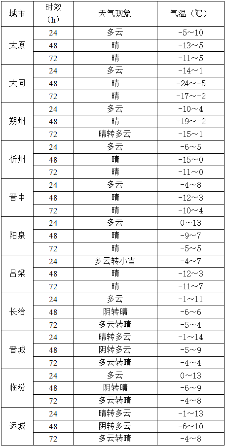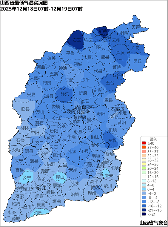 12月18日07时至19日07时,全省各地最低气温介于-16.4℃(右玉)~1.5℃(壶关)之间。太原、大同、阳泉、晋城、朔州、晋中、忻州和吕梁的全域,长治、运城和临汾的大部共113个县(市、区)最低气温在0℃以下,其中,偏关、平鲁区、沁源、阳曲、朔城区、天镇、寿阳、定襄、娄烦、五寨、灵丘、代县、应县、岚县、左权、云州区、静乐、浑源、平城区、云冈区、五台、广灵、新荣区、右玉共24个县(市、区)在-10℃以下。