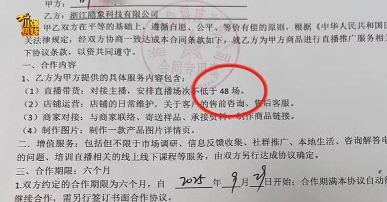 9月底,邵女士专程赶到台州的浙江隐象科技有限公司考察,并签订了一份价值16800元的直播带货合同。合同约定,六个月内直播48场,佣金比例为10%。为此,邵女士特意新开了一家网店,准备迎接预期中的网络订单。