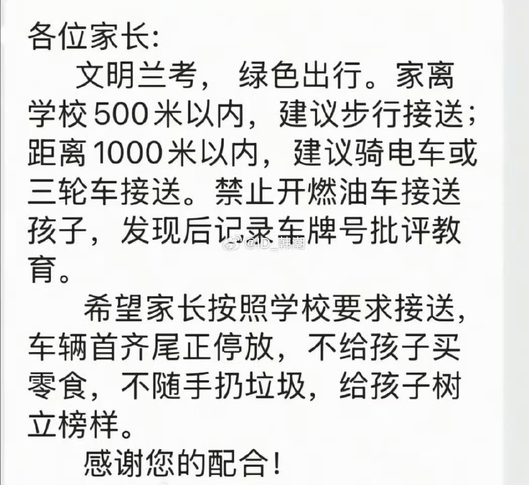 “严禁”通知不管是谁下的,显然没有考虑过家庭的实际情况。现在又不是每家每户都有新能源车和电动车,距离远的家庭,如果只有燃油车,看到这样的通知,以后又该怎么接送孩子呢?这不是无端给家长增加负担吗?