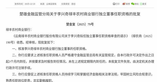 2025年12月19日,根据国家金融监督管理总局消息,《云南禄丰农村商业银行股份有限公司关于李兴奇拟任独立董事任职资格审查的请示》获得通过,批复李兴奇云南禄丰农村商业银行股份有限公司独立董事的任职资格。