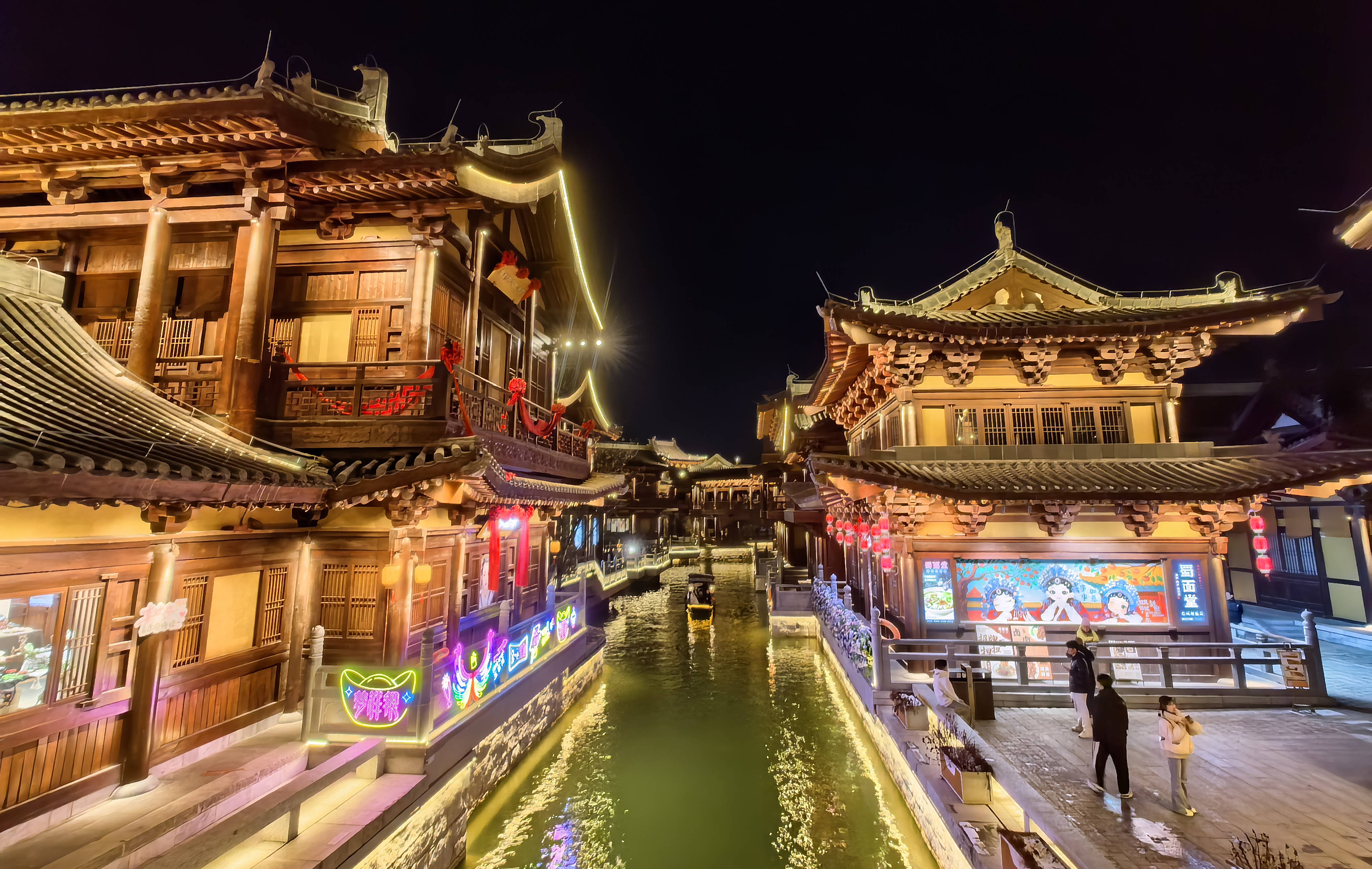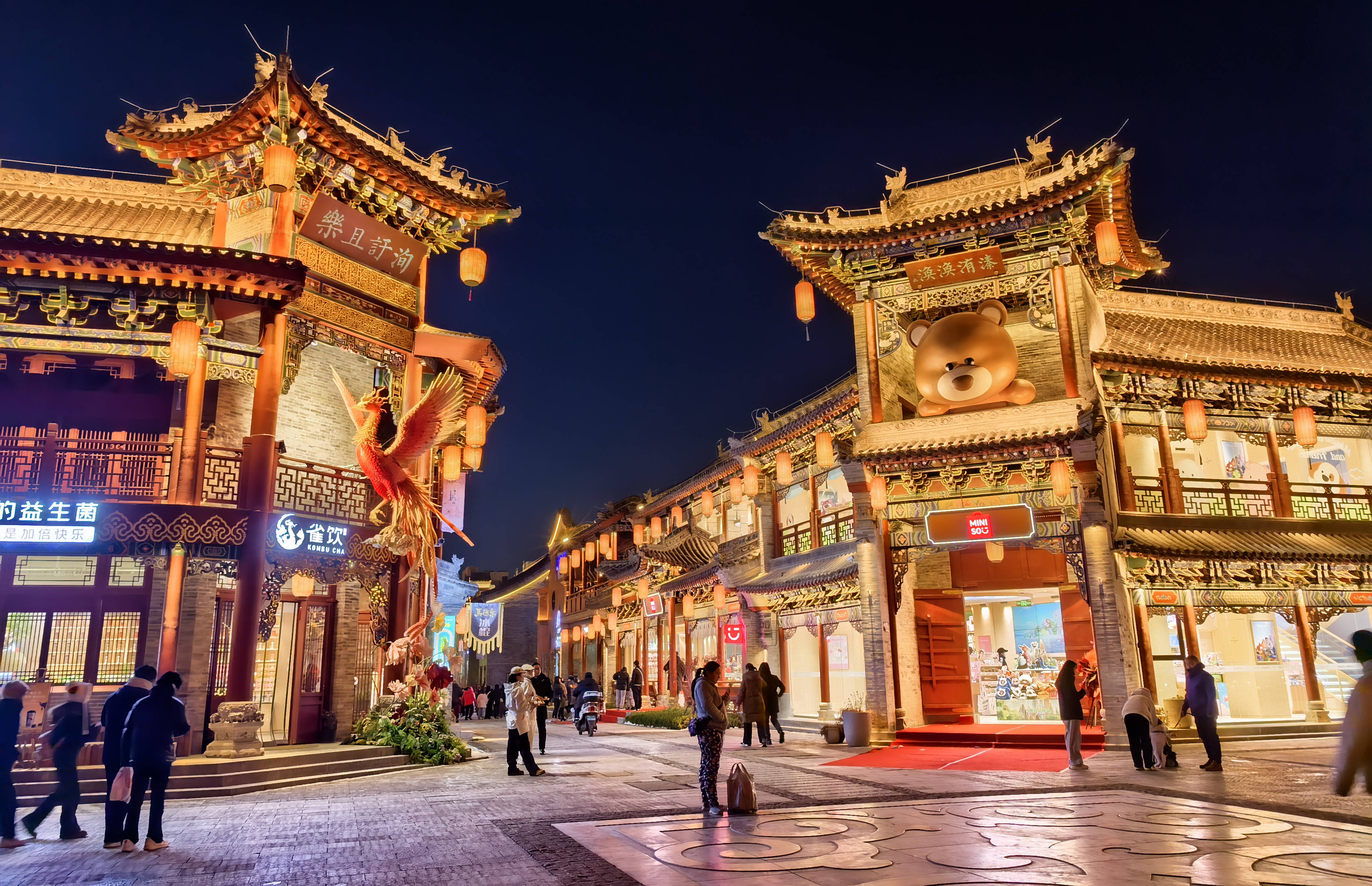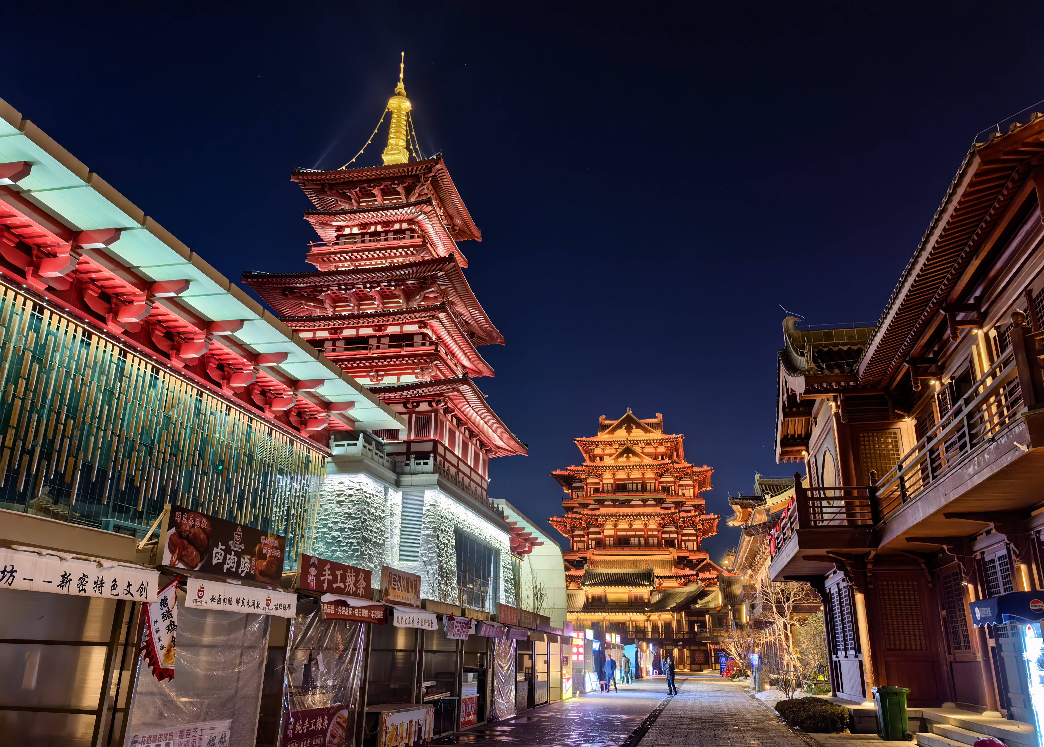 夜幕降临,位于河南省新密市的溱洧水城灯光璀璨,夜景迷人,吸引各地游客前来参观。