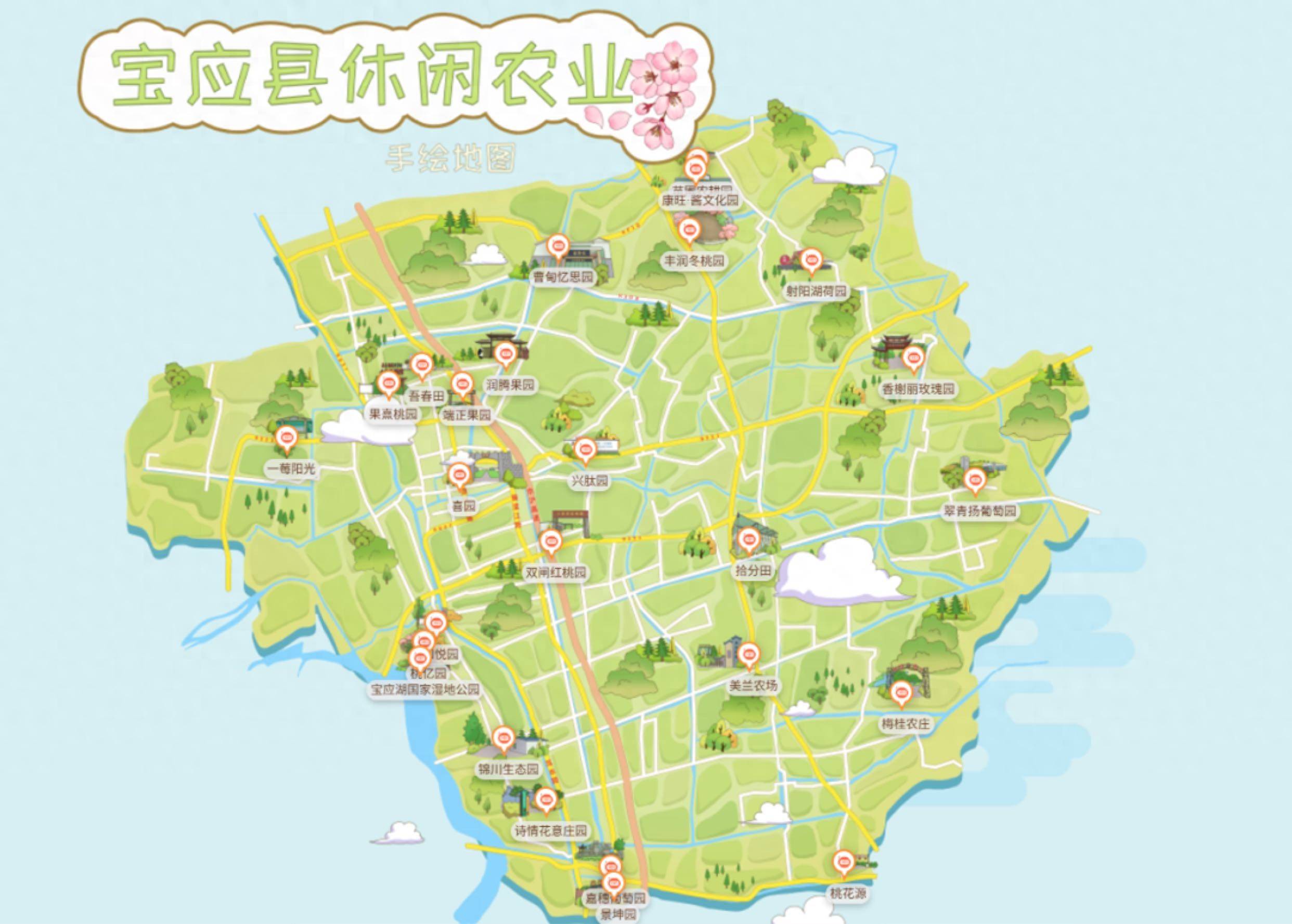 地图以温暖清新的手绘风格绘制,生动呈现了宝应辽阔的田野、飘香的果园、平静的河流与蜿蜒的道路,彻底告别了传统电子地图的冰冷线条。图中每一个农场、果园、民宿与景点都化为灵动温馨的图标,使地图本身成为一件值得收藏的艺术品,让田园之趣从规划之初便浸润于视觉美感之中。