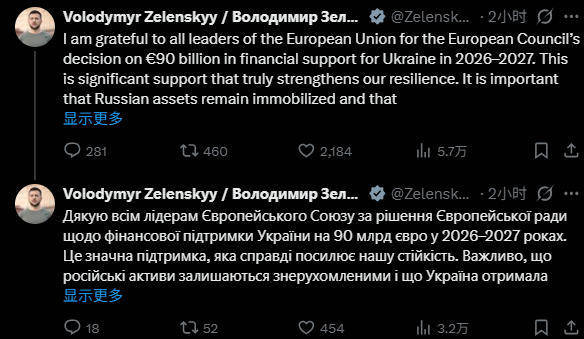 同日,乌克兰总统泽连斯基发文感谢欧盟提供的900亿欧元贷款。