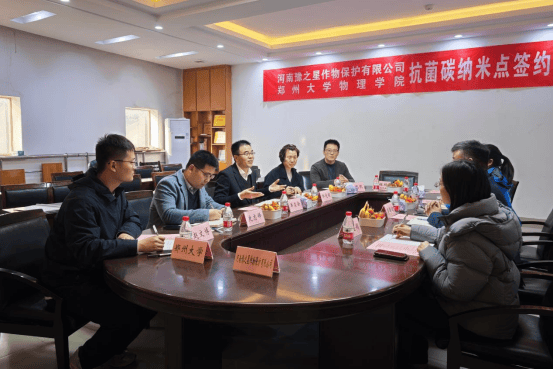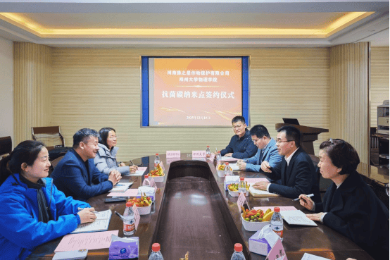 2025年12月19日下午,河南豫之星作物保护有限公司(以下简称“豫之星”)与郑州大学物理学院抗菌碳纳米点项目签约仪式在郑州大学南校区举行。郑州大学副校长单崇新、科研院副院长乔宪丽,物理学院副院长史志锋、豫之星董事长李国建及双方相关负责人出席仪式,仪式由郑州大学物理学院副院长史志锋主持。