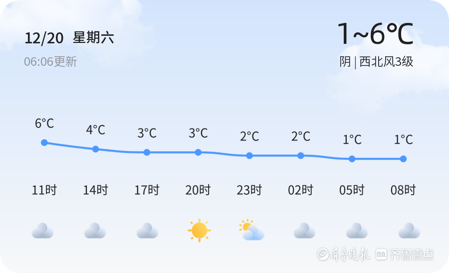 今天是2025年12月20日,星期六,农历十一月初一。威海市今日天气阴沉,气温在1℃至6℃之间,北风3-4级,空气湿度高达93%,PM2.5指数为221。全市各区天气情况基本一致,均为阴天,北风3-4级。预计今天白天最高气温6℃,最低气温1℃。