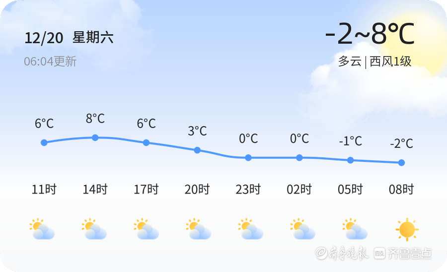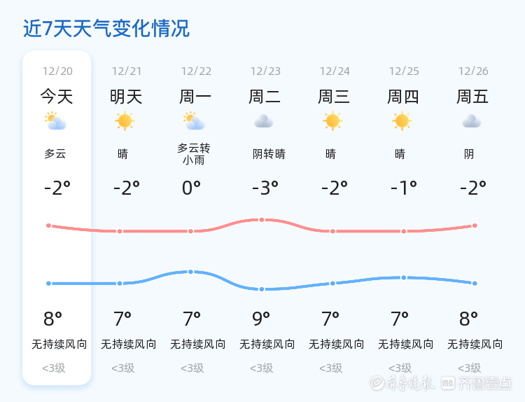 今天是2025年12月20日,农历十一月初一,星期六。济宁市今日天气多云,气温介于-2℃至8℃之间,风力较小,为西风1级,空气湿度较高,达到78%。全市各区天气情况基本一致,均为多云,市民出行请注意保暖。明日天气预计为晴天,气温与今日持平,最低气温-2℃,最高气温7℃。风力依旧较小,为无持续风向,市民可适当增加户外活动时间,享受冬日阳光。未来三天,济宁市天气趋势平稳,以多云、晴天为主。其中,周一(12月22日)将有小雨天气,气温有所回升,最低气温0℃,最高气温7℃。周二(12月23日)天气阴转晴,最低气温-3℃,最高气温9℃。周三(12月24日)至周五(12月26日),天气以晴到阴为主,气温在-2℃至8℃之间波动。提醒市民根据天气变化适时增减衣物,特别是周一的小雨天气,出行请注意防滑。温馨提示