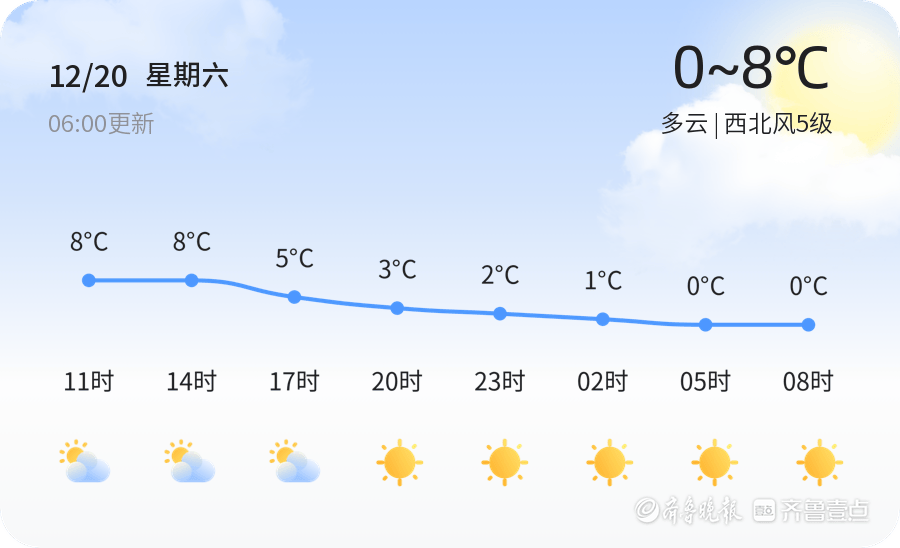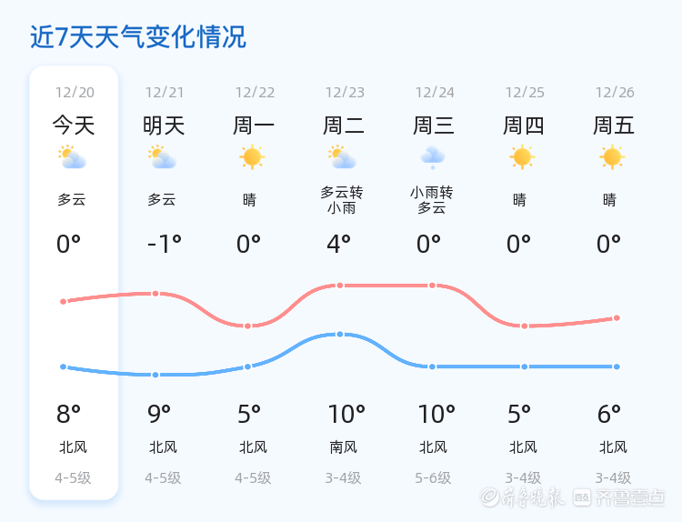 今天是12月20日,星期六,农历十一月初一。青岛市今日天气以多云为主,气温范围在0℃至8℃之间,北风4-5级。各区天气状况基本一致,均为多云,风力较大,市民出行需注意防风保暖。当前温度为4.7℃,湿度较高,PM2.5指数为219,空气质量需关注。