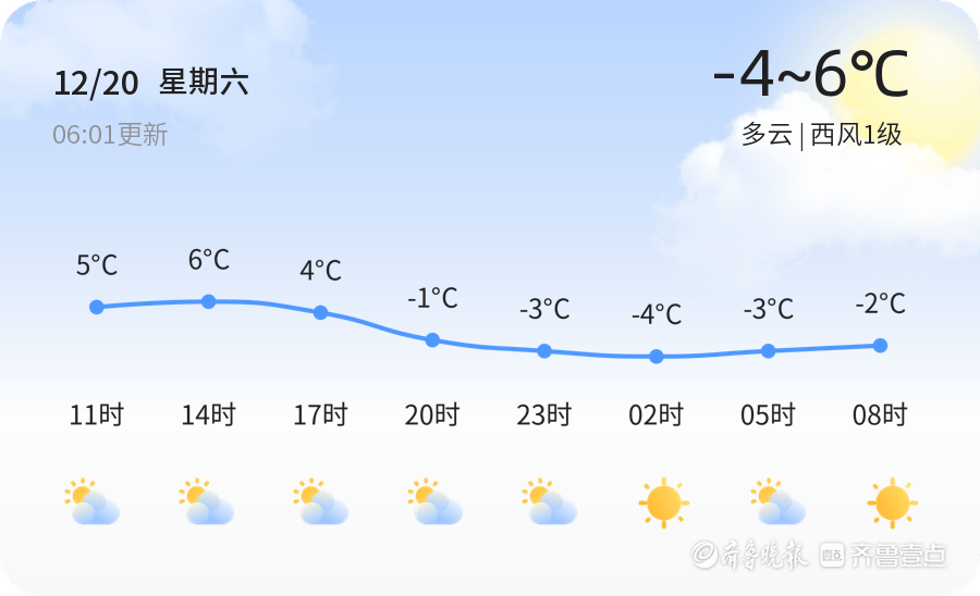 今天是12月20日,星期六,农历十一月初一。淄博市今日天气多云,气温范围在-4℃到6℃之间,当前温度为2.8℃。风向为西风1级,空气湿度为53%。空气质量方面,PM2.5指数为119,属于轻度污染。建议市民外出时佩戴口罩,注意防护。今天的天气对市民的出行影响不大,但由于气温较低,早晚温差较大,市民需注意保暖,特别是早晨和夜间出行时,应增添衣物以预防感冒。