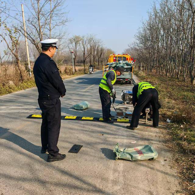 完善减速设施:在村庄出入口、学校周边等人员密集路段,铺设减速带13条。在不影响正常通行的前提下,强制车辆降速,降低交通事故发生概率。