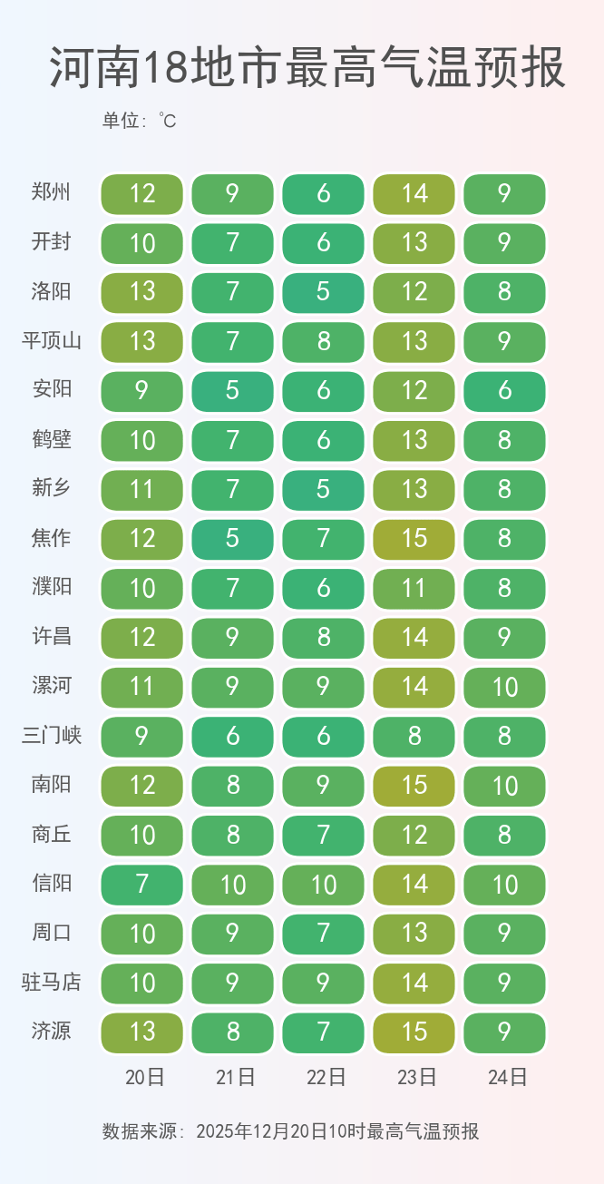 在冷空气的接连打压下,未来五天河南的气温将频繁出现波动,其中今天和下周二的最高气温相对处在高位,大部地区在10~15℃,其余时间仅有个位数。最低气温则会持续低迷,基本都在冰点以下,早晚寒意十足,大家出门一定要穿厚些,谨防感冒。