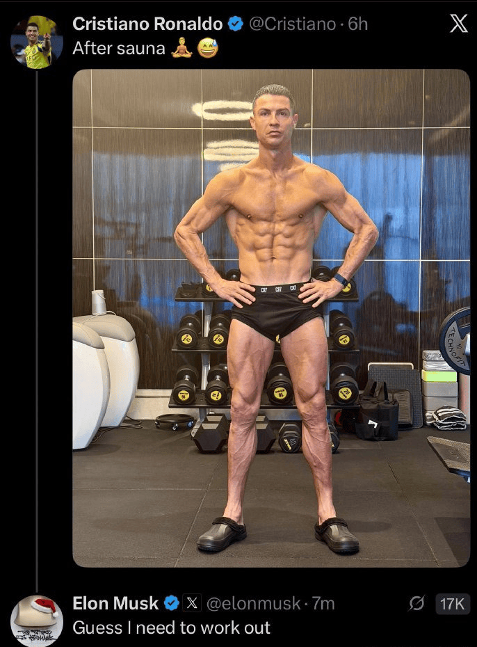 马斯克被惊到了,在评论区回复:“我想我需要锻炼一下了”。