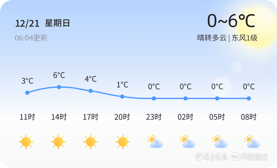 今天是2025年12月21日,星期日,农历十一月初二,冬至节气。济宁市今日天气晴转多云,气温范围在0℃至6℃之间,当前温度为-1.6℃。风向为东风1级,空气湿度为75%,PM2.5指数为68,空气质量状况为良好。今日天气适宜出行,但早晚温差较大,市民需注意保暖。