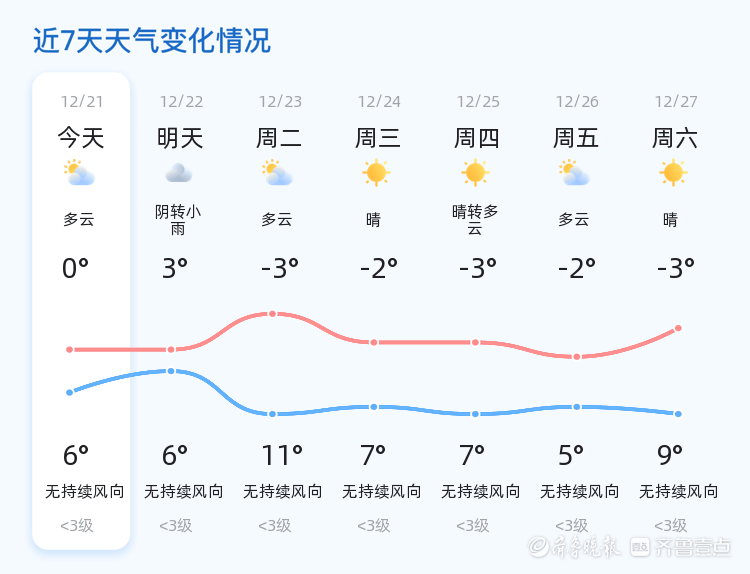 未来三天,菏泽市天气趋势总体平稳。12月23日为多云天气,气温有所回升,最低气温-3℃,最高气温11℃;12月24日至25日,天气以晴到多云为主,气温波动不大,最低气温-3℃至-2℃,最高气温7℃至9℃。市民需根据天气变化及时增减衣物,尤其是早晚温差较大,建议早晚出行时增添保暖装备。