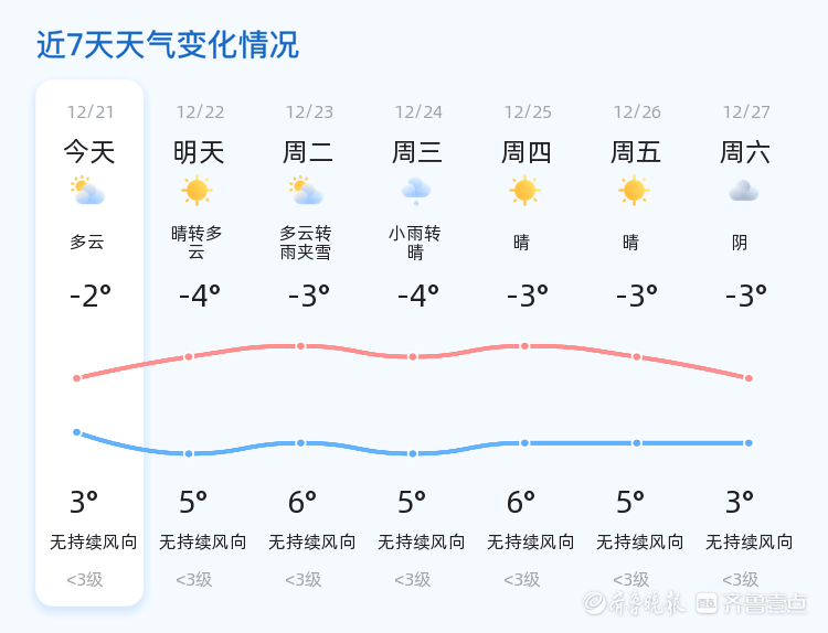今日是2025年12月21日,星期日,农历十一月初二。今天是二十四节气中的冬至,标志着北半球白天最短、黑夜最长的一天。冬至过后,白昼渐长,阳气回升。今日泰安市天气晴转多云,气温在-2°C至3°C之间,东北风2级,空气湿度45%,PM2.5指数57,空气质量良好。各区县天气情况基本一致,均为晴转多云。冬至是北半球冬季的重要节气,市民应注意保暖,适当进补,增强体质,预防感冒。