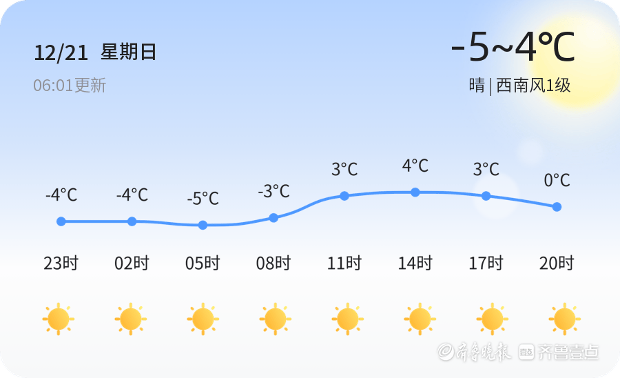 今天是12月21日,农历十一月初二,淄博迎来冬至节气。今日天气晴朗,西南风1级,空气质量为良(PM2.554),适合户外活动。当前温度为-7.3℃,白天气温最高可达4℃,夜间最低气温为-5℃。由于早晚温差较大,市民出行时需做好防寒保暖措施,建议佩戴口罩以应对低温环境。冬至是二十四节气之一,标志着白昼最短、黑夜最长的一天。民间有‘冬至大如年’的说法,提醒市民在寒冷天气中注意饮食调理,多吃温热食物,保持身体温暖。未来三天,淄博天气以晴到多云为主,气温较为平稳。明天12月22日,天气晴转多云,温度范围在-5℃至5℃之间;12月23日,多云转小雨,气温略有回升,最高气温可达7℃。由于23日有小雨天气,市民出行时需携带雨具,注意道路湿滑,确保行车安全。温馨提示