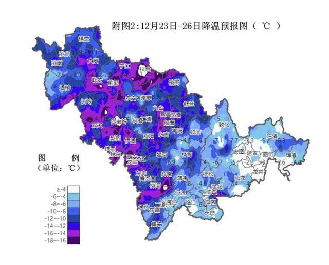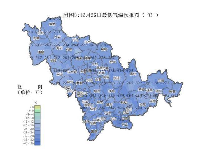 伴随降雪,气温将自西向东明显下降。23日降温幅度普遍可达10~14℃,局部地区可达16℃左右。最低气温将出现在26日早晨,东部山区可达零下30~-28℃,其他地区为零下28~-24℃。预计27日起气温开始回升。