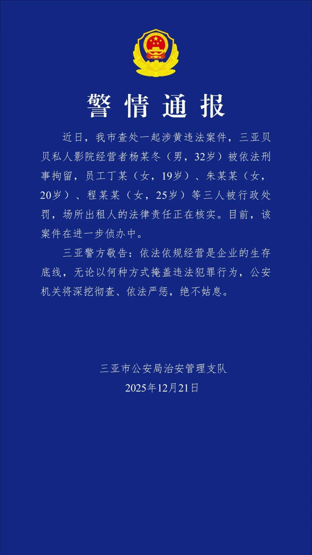 近日,我市查处一起涉黄违法案件,三亚贝贝私人影院经营者杨某冬(男,32岁)被依法刑事拘留,员工丁某(女,19岁)、朱某某(女,20岁)、程某某(女,25岁)等三人被行政处罚,场所出租人的法律责任正在核实。目前,该案件在进一步侦办中。
