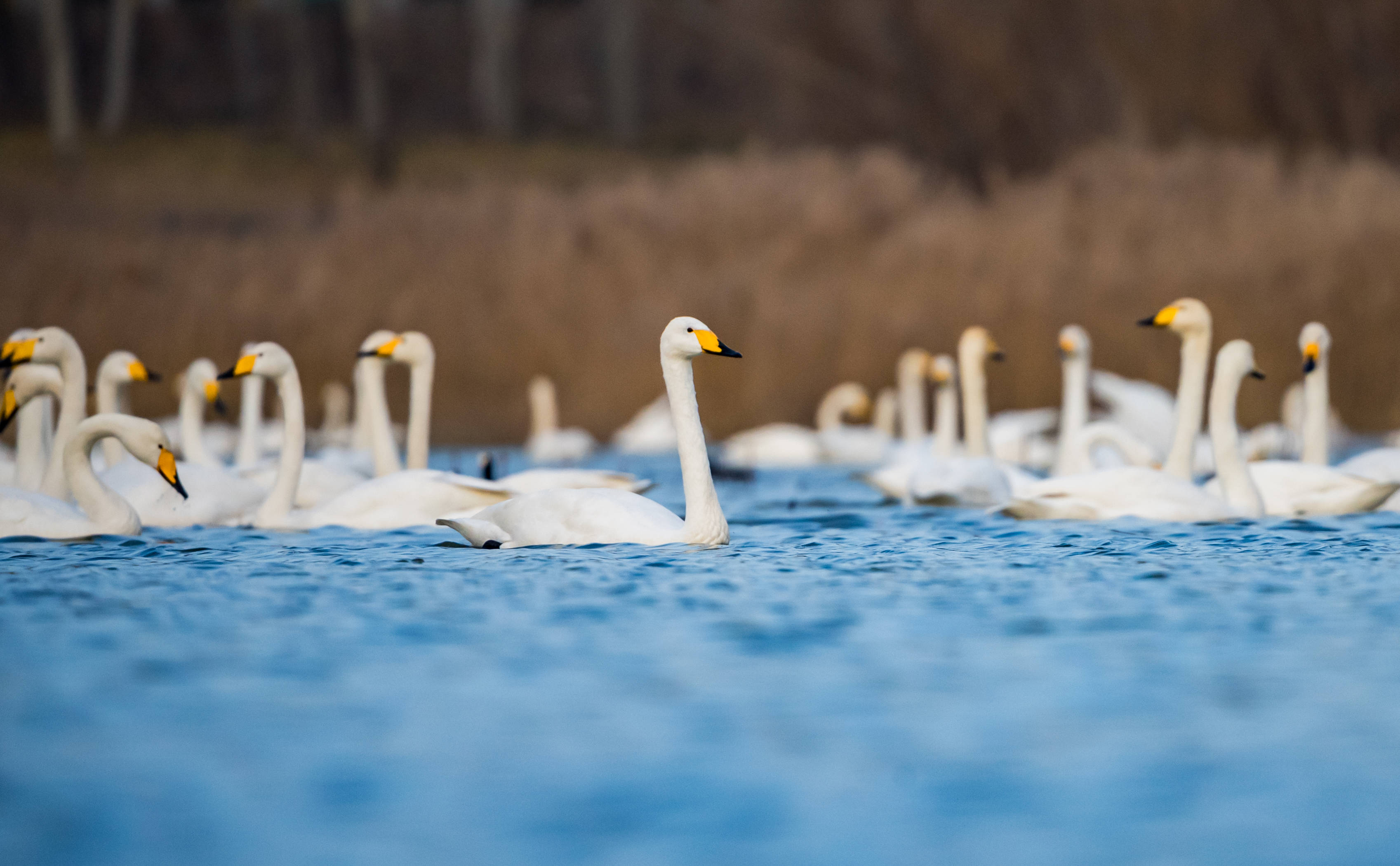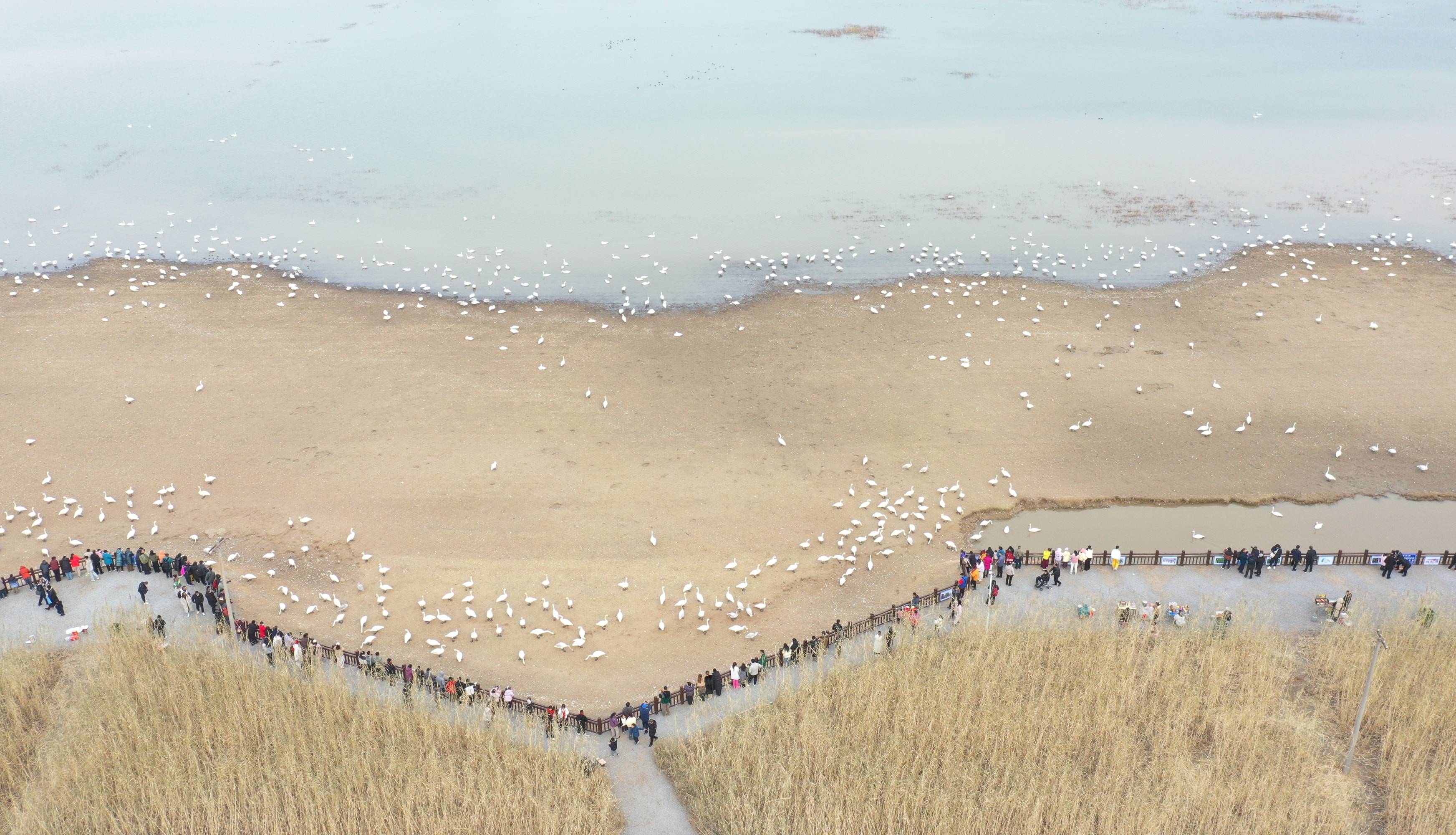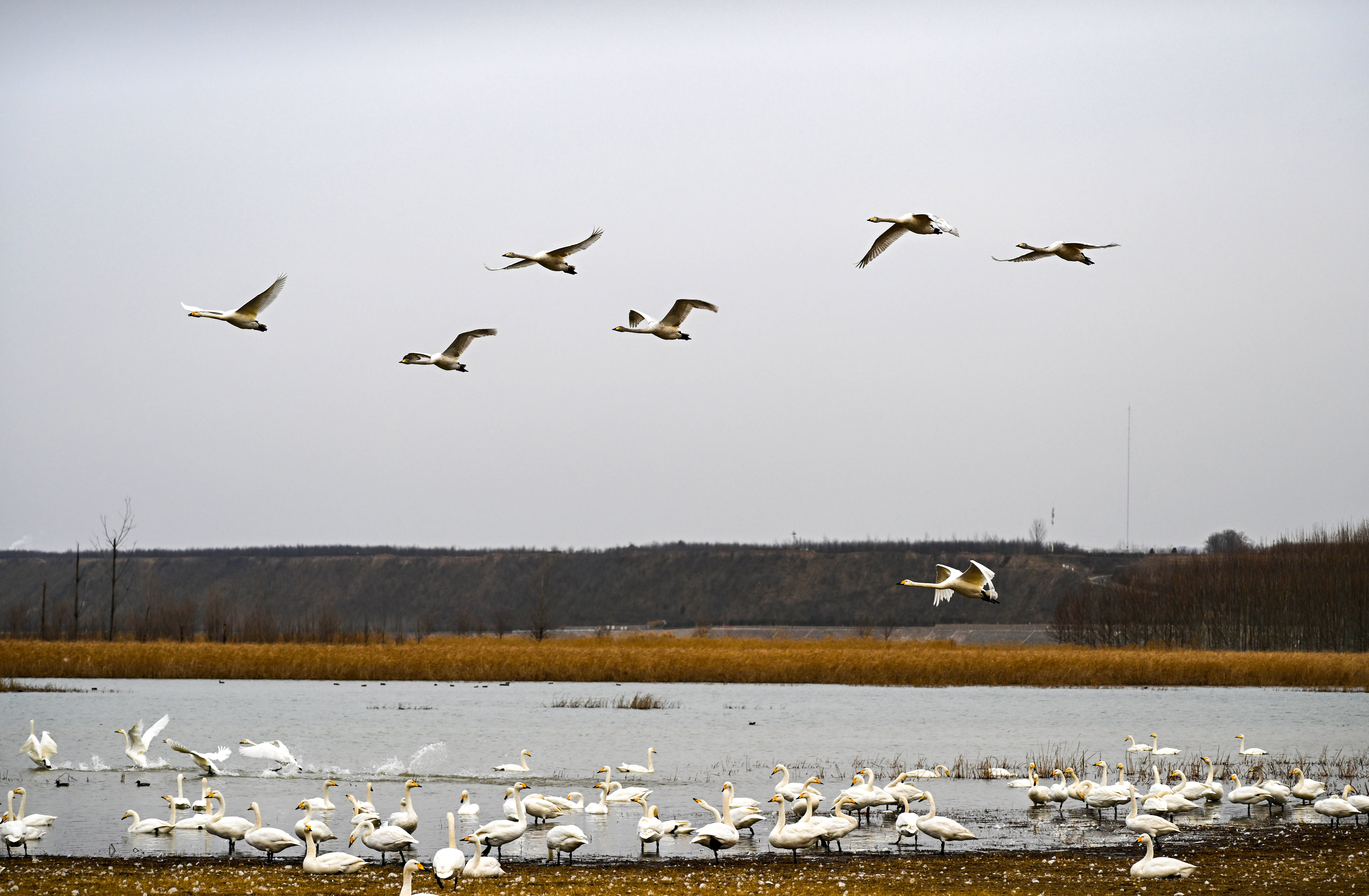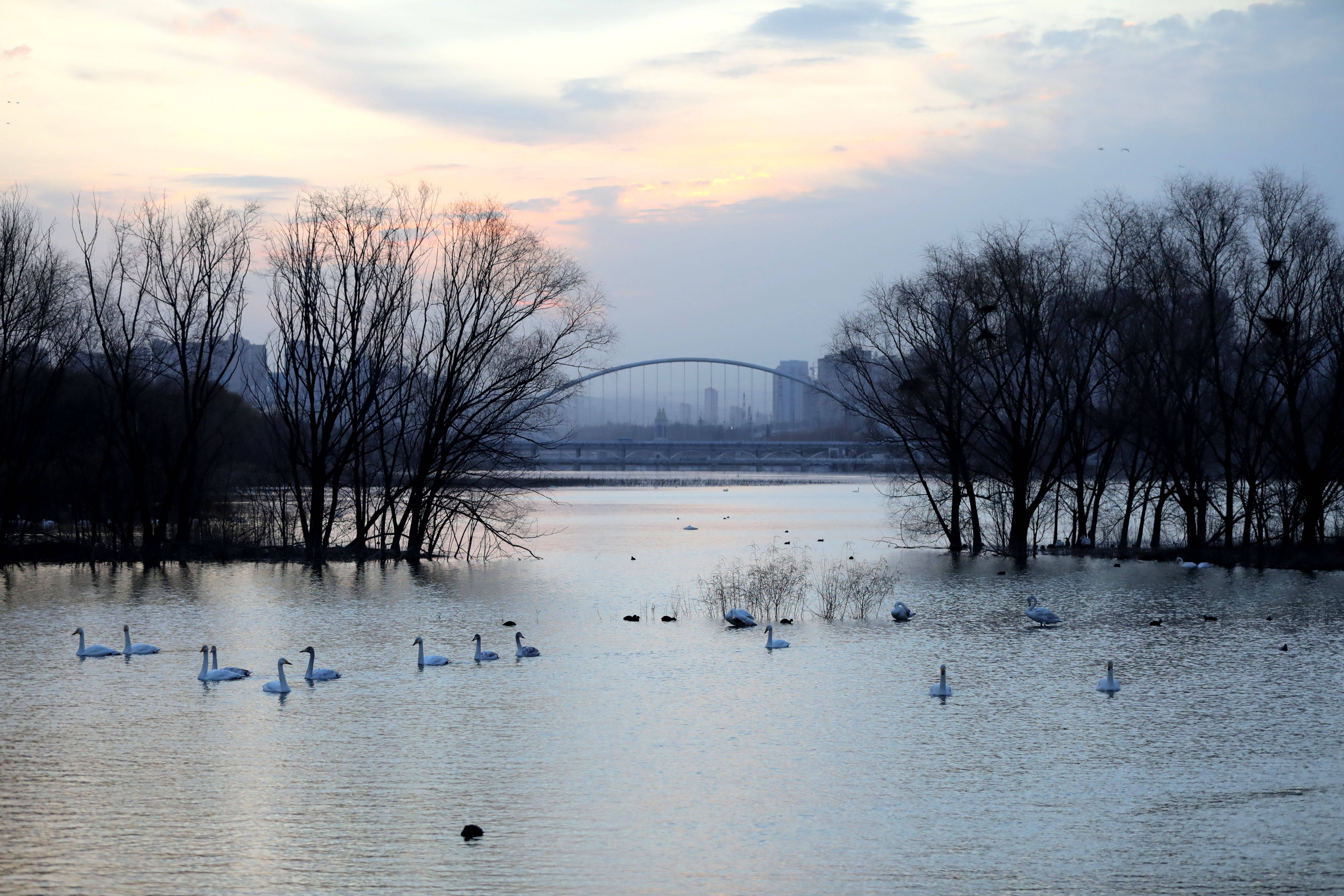 进入冬季,大批白天鹅来到河南省三门峡市黄河湿地栖息越冬。近年来,随着当地不断加强黄河沿岸湿地生态保护工作,白天鹅的数量逐年增加。目前,三门峡黄河岸边40余万亩浅滩湿地已迎来万余只白天鹅。