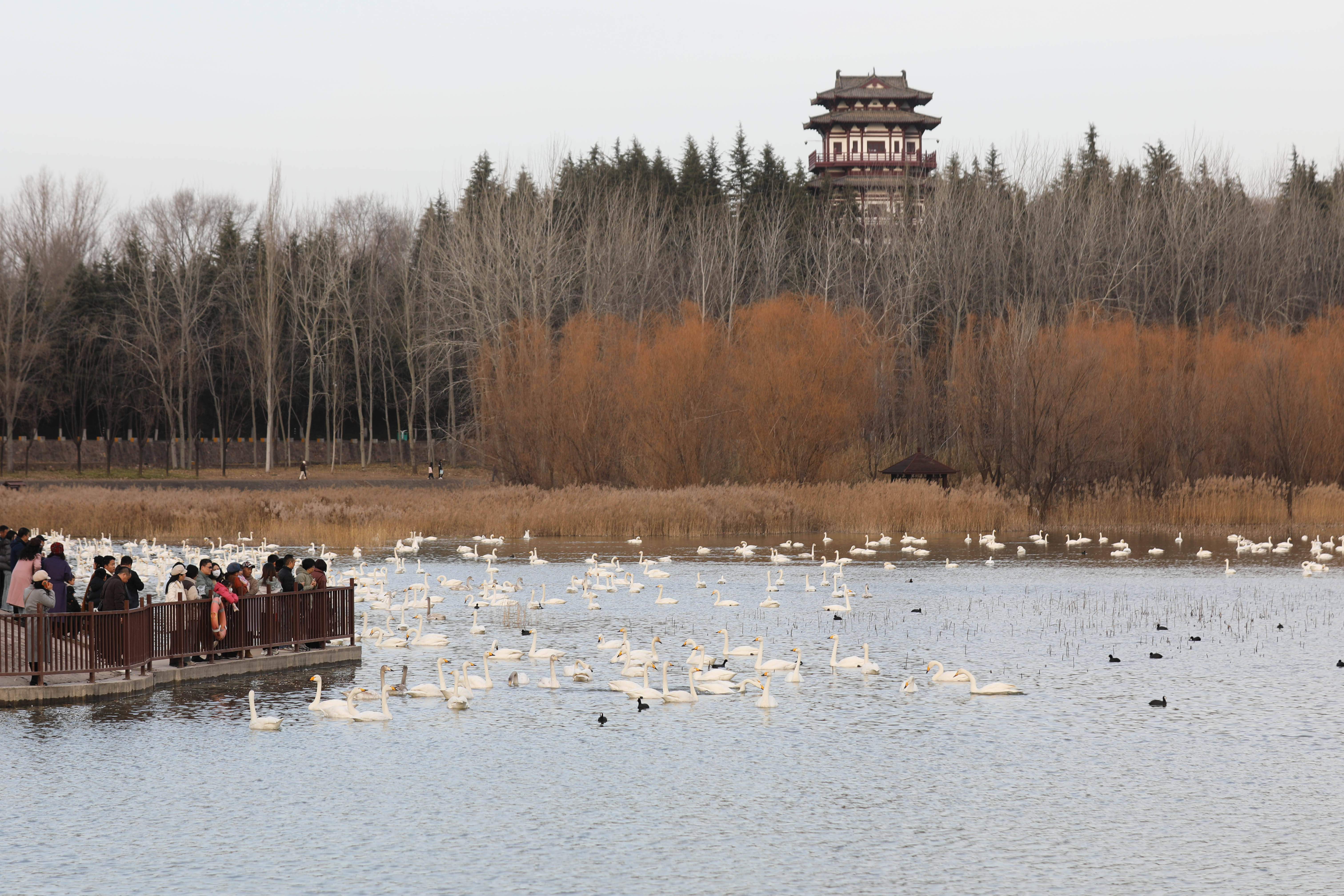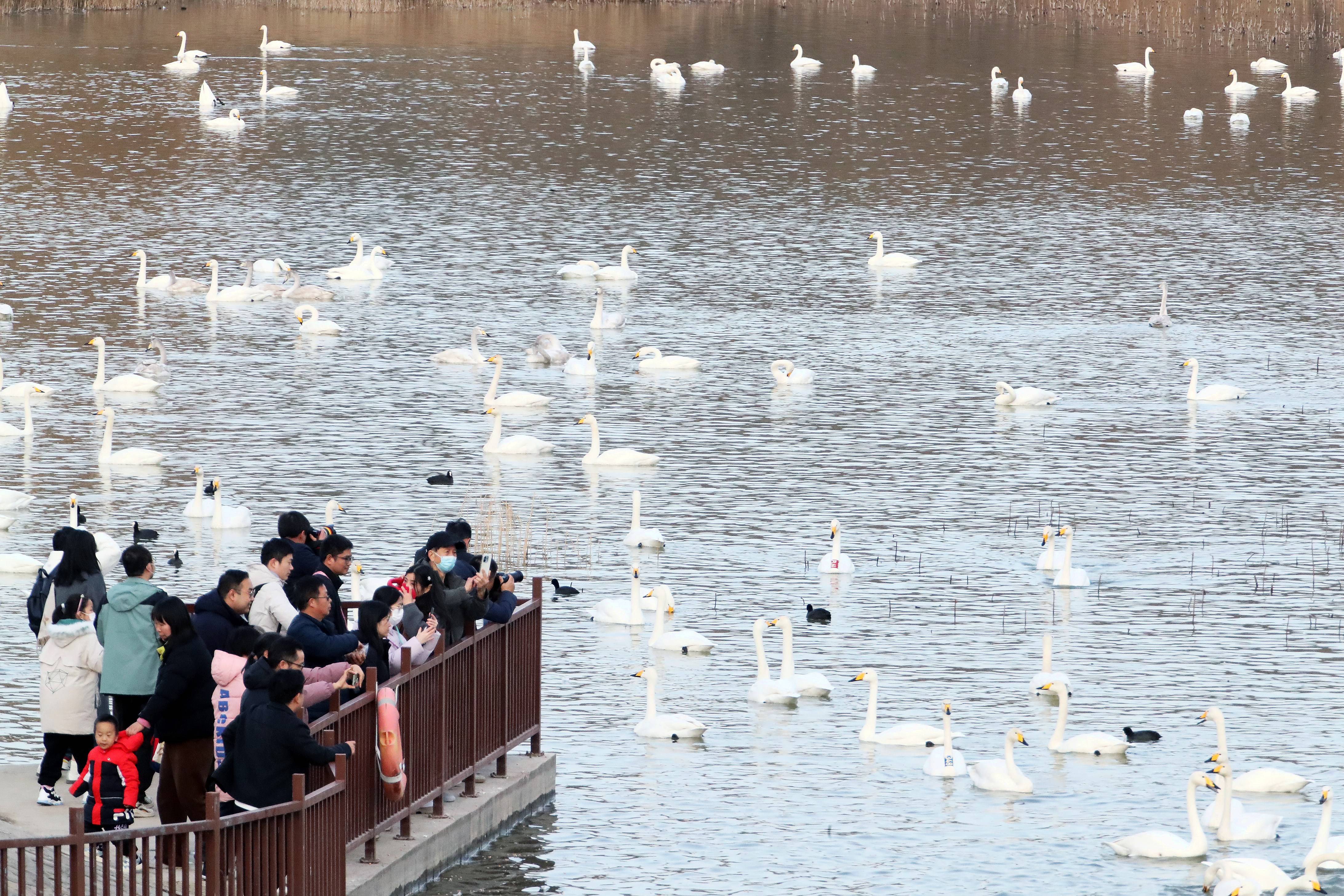 12月20日,游客在河南省三门峡市天鹅湖国家城市湿地公园观赏白天鹅。 新华社发(赵永涛摄)