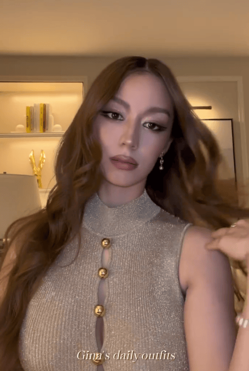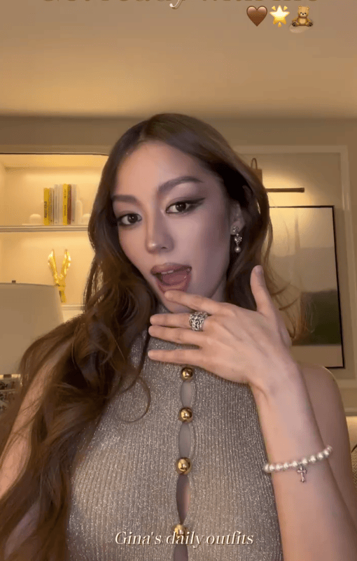 吉娜抚摸嘴唇,举手投足间尽显迷人魅力。