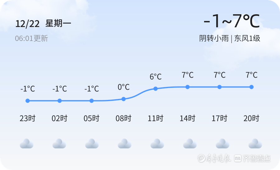 今天是12月22日,星期一,农历十一月初三。枣庄市今日天气为阴转小雨,气温在-1℃至7℃之间,东风1级,空气湿度59%,PM2.5指数31。各区天气情况总体保持一致,均为阴转小雨,气温略有波动,但整体较为平稳。
