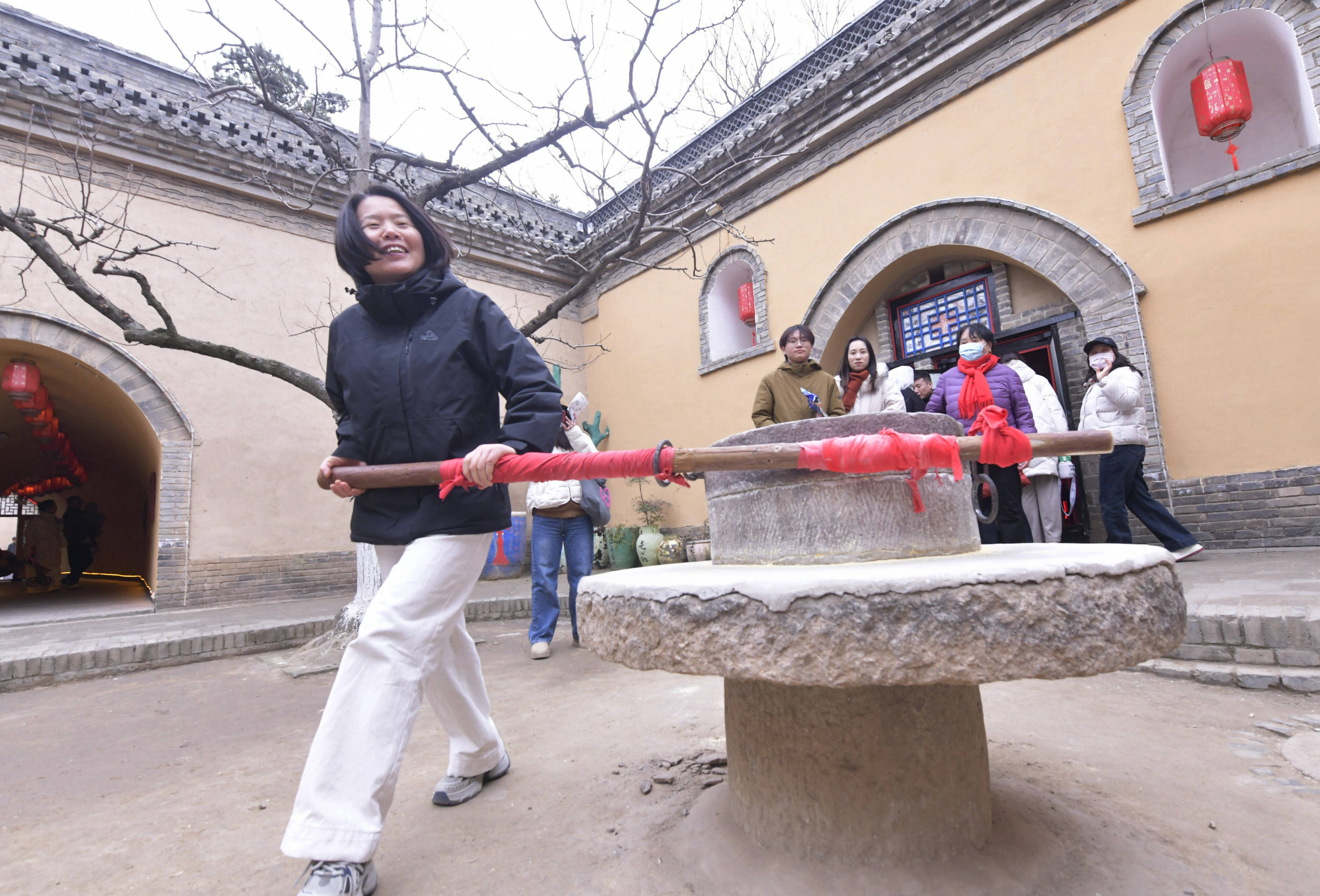 12月21日,游客在河南省三门峡市陕州区张汴乡北营村地坑院体验推石磨。 新华社发(赵永强摄)