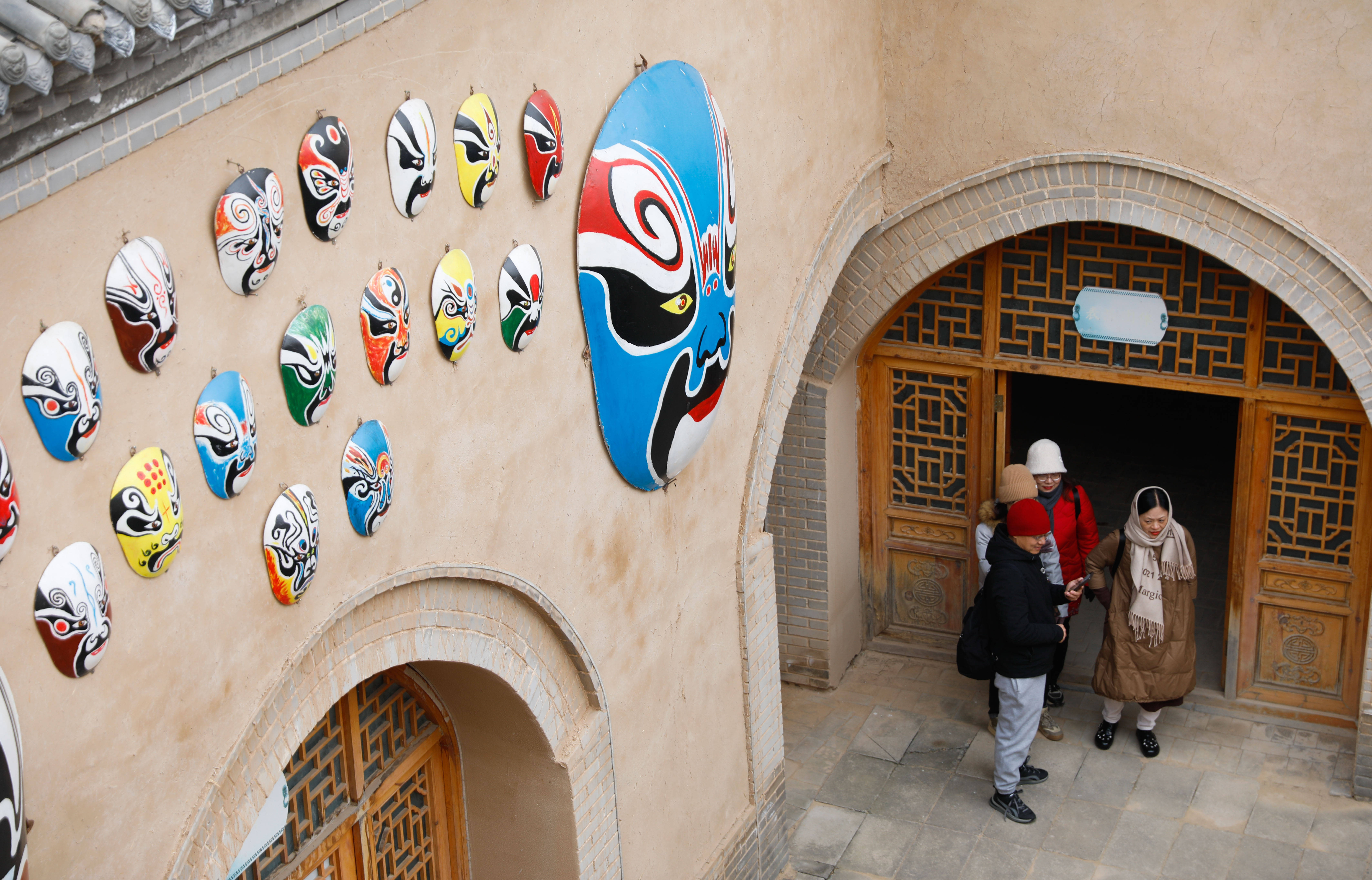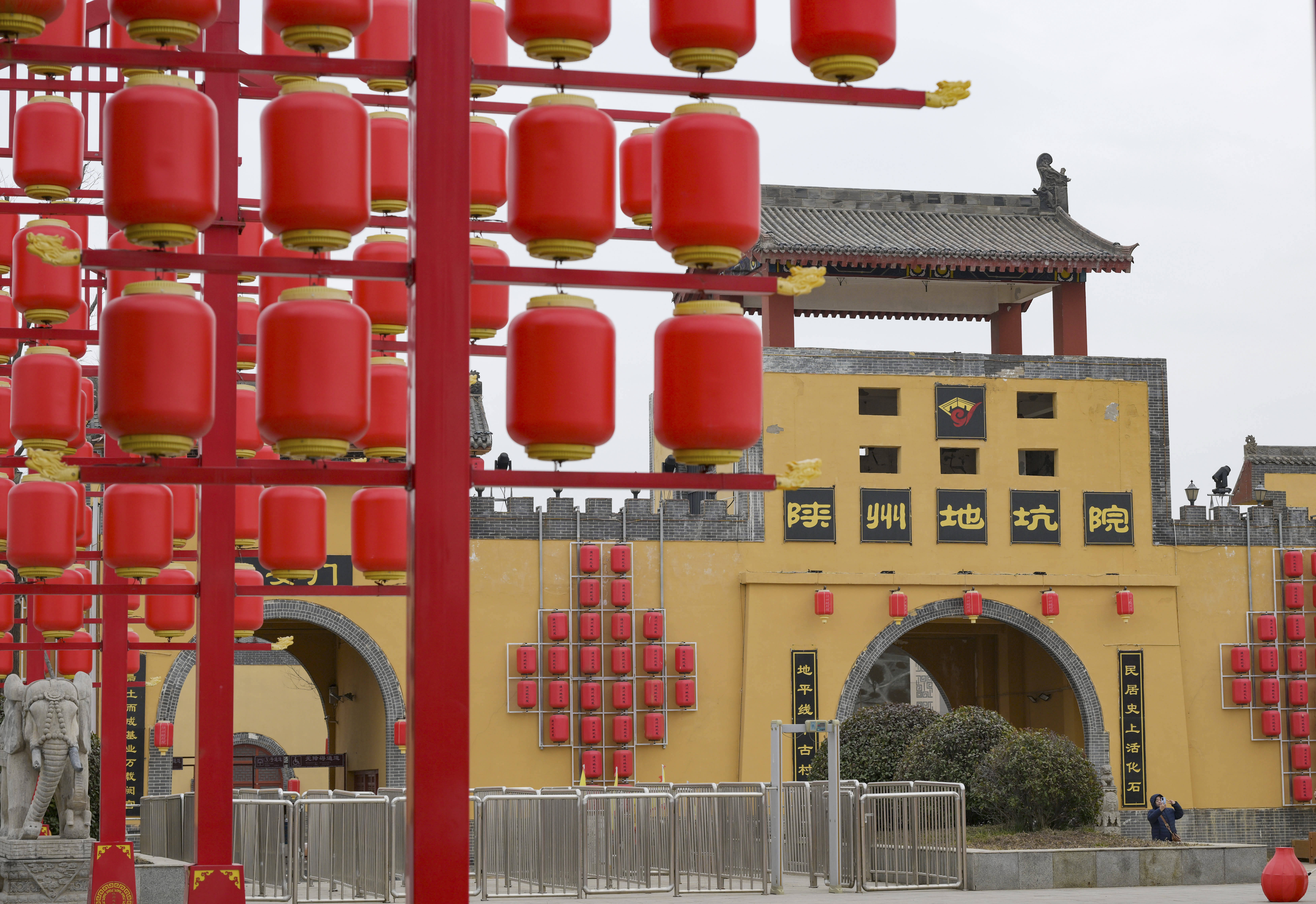 12月21日,游客在河南省三门峡市陕州区张汴乡北营村地坑院大门口拍照。 新华社发(苗育才摄)