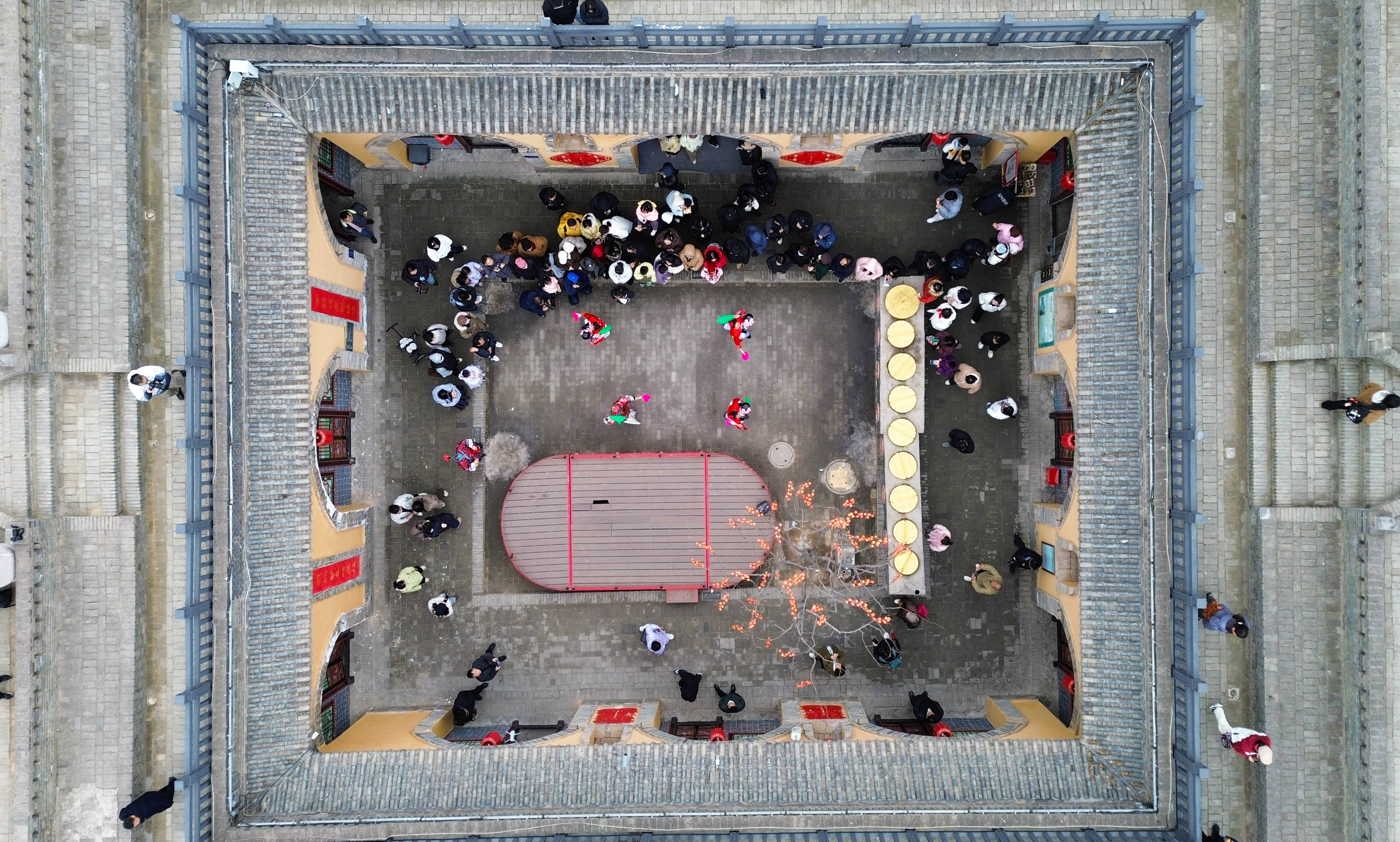 12月21日,河南省三门峡市陕州区张汴乡北营村地坑院民俗表演吸引游客观看(无人机照片)。 新华社发(牛书培摄)