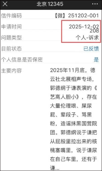 其中一张是投诉截图,内容显示,“2025年11月底德云社北展相声专场,郭德纲与于谦所表演的《艺高人胆小》节目中,涉及大量伦理哏、荤段子、辱骂黑粉以及造谣抹黑国营院团等台词内容。”