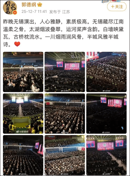 针对此事,12月7日,郭德纲在微博发帖,提到“昨晚(6日)无锡演出,人心雅静,素质极高。”疑似回应传言。