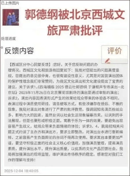 另一张则是相关部门的回复,并被网友配上了“郭德纲被北京西城文旅严肃批评”的红字,图片显示,西城区分中心反馈称:“表演过程中使用砸挂、谐音梗等方式,确实有低俗不雅行为,已经对表演者做出了严肃的批评教育”。