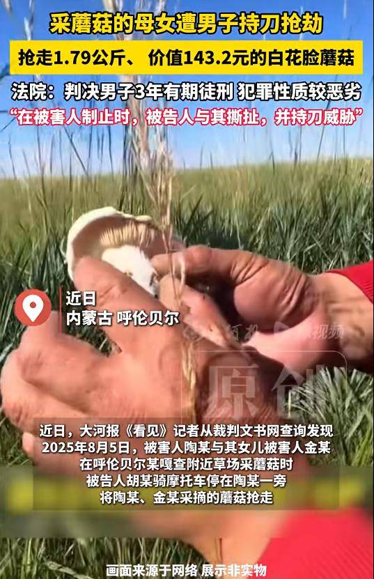 近日,记者从裁判文书网获悉,2025年8月5日,陶某与其女儿金某在呼伦贝尔某嘎查附近草场采蘑菇时,男子胡某骑摩托车停在陶某一旁,抢二人采摘的蘑菇。