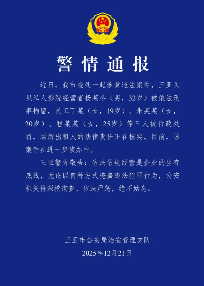 近日,我市查处一起涉黄违法案件,三亚贝贝私人影院经营者杨某冬(男,32岁)被依法刑事拘留,员工丁某(女,19岁)、朱某某(女,20岁)、程某某(女,25岁)等三人被行政处罚,场所出租人的法律责任正在核实。目前,该案件在进一步侦办中。三亚警方敬告:依法依规经营是企业的生存底线,无论以何种方式掩盖违法犯罪行为,公安机关将深挖彻查、依法严惩,绝不姑息。