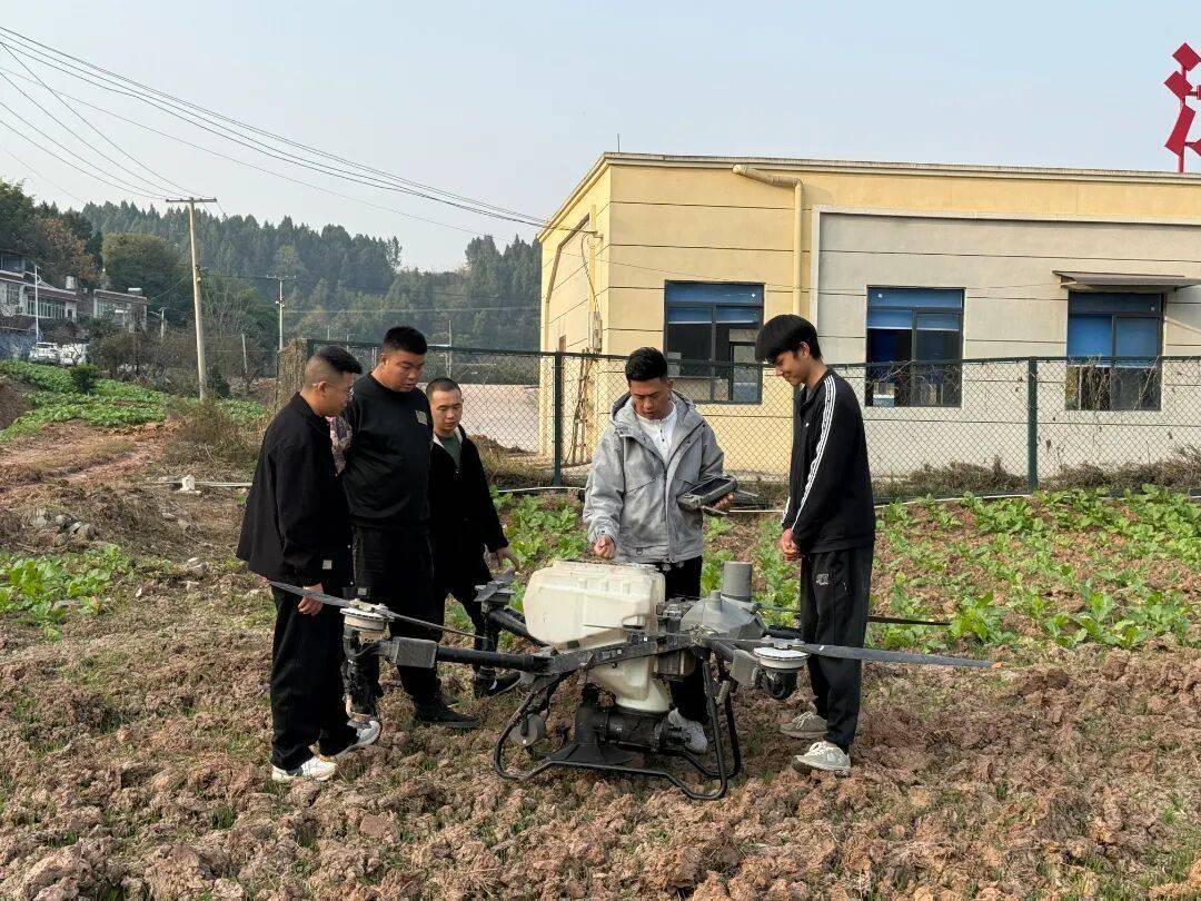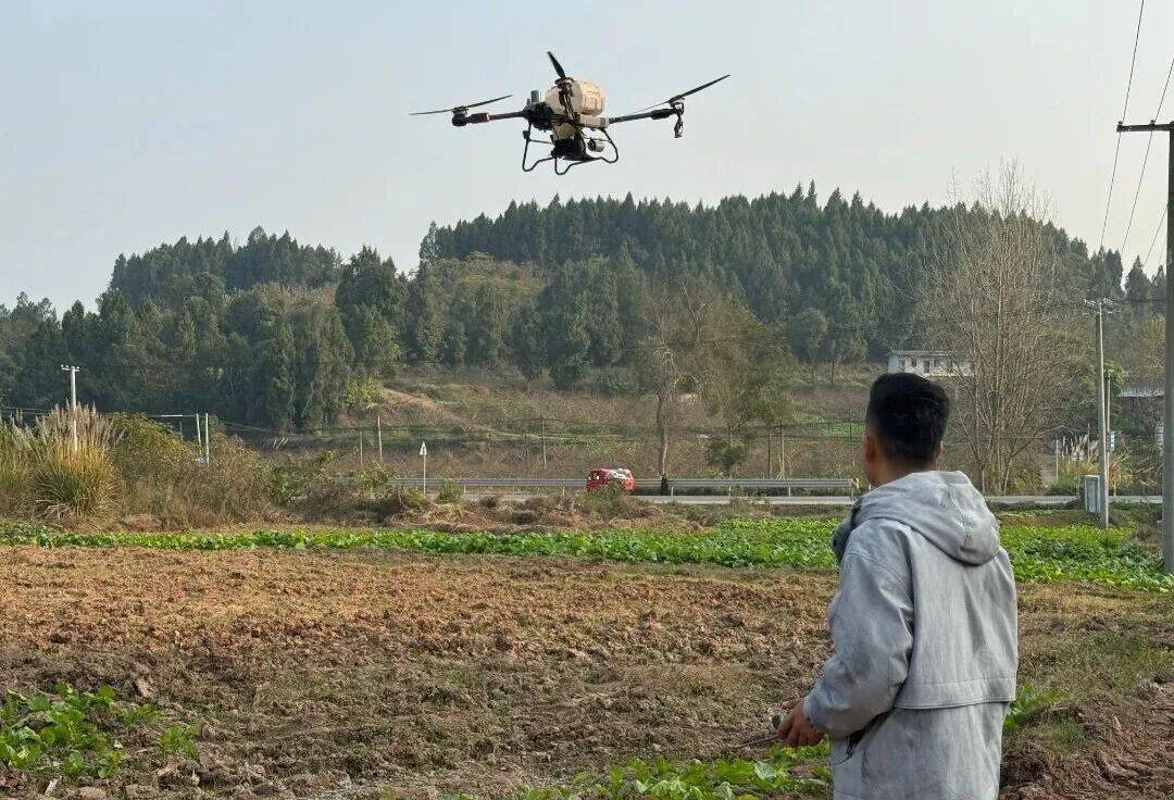 在施家镇龙河村的田地上空,一架无人机正平稳飞行,均匀喷洒出细密雾滴。27岁的罗航手持遥控器,专注地盯着屏幕,不时向身旁几位年轻人讲解操作要领。
